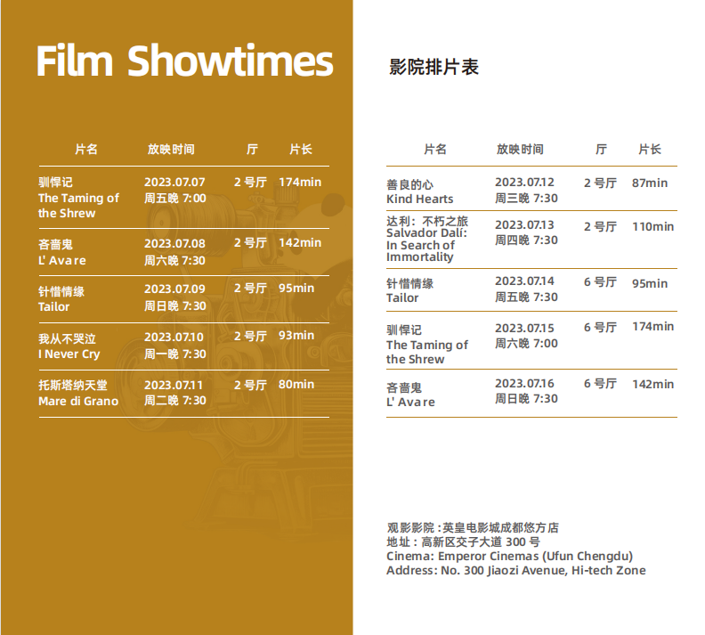 本次電影周選取的影片極具代表性。紀錄片《達利:不朽之旅》講述了西班牙超現(xiàn)實主義藝術(shù)家薩爾瓦多·達利的傳奇一生與傳世畫作;取材于英國杰出戲劇家莎士比亞最具“冒犯性”劇本的戲劇片《馴悍記》,在全片“笑果”不斷的同時,也用“以古現(xiàn)今”的方式引發(fā)觀眾對當下的思考;取材于法國著名劇作家莫里哀代表作的戲劇片《吝嗇鬼》,生動描繪了世界文學(xué)史上“四大吝嗇鬼”之一“阿巴貢”的形象;精彩呈現(xiàn)意大利風(fēng)光的《托斯塔納天堂》將跟隨一群兒童冒險家漫游到意大利托斯塔納……