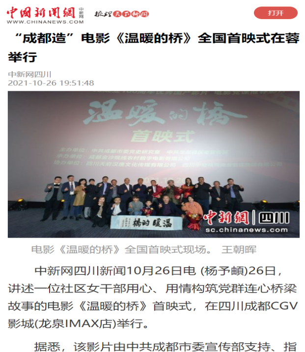 | 2 | 成都造電影《溫暖的橋》全國首映式在龍泉驛區(qū)舉行 | http://sc.china.com.cn/2021/difang/1325/1026/424065.html | 中國網(wǎng) | 網(wǎng)絡(luò) | 央媒 |