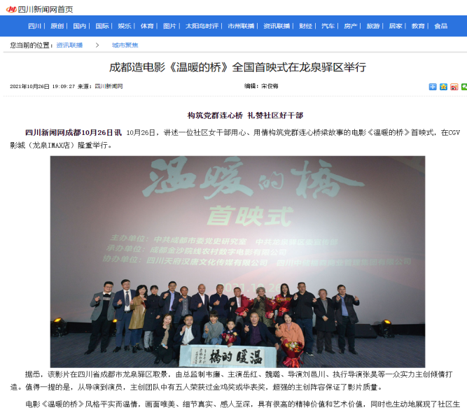 | 4 | 成都造電影《溫暖的橋》全國首映式在龍泉驛區(qū)舉行 | http://city.newssc.org/system/20211026/003213628.htm | 四川新聞網(wǎng) | 網(wǎng)絡(luò) | 省媒 |